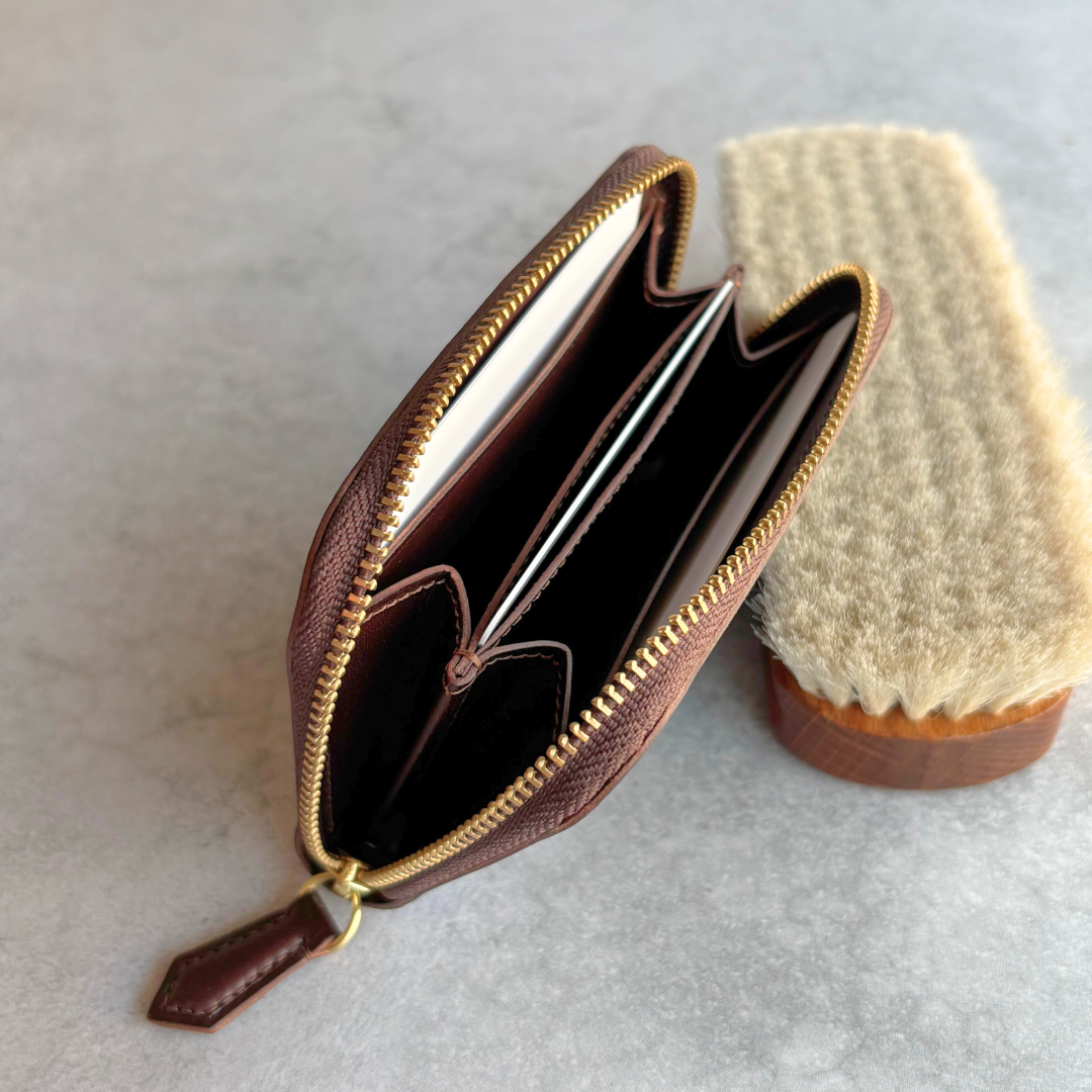 染料仕上げによる上品な発色とツヤが目を引き、手に取るとサラッとした質感が心地よく手に馴染みます。