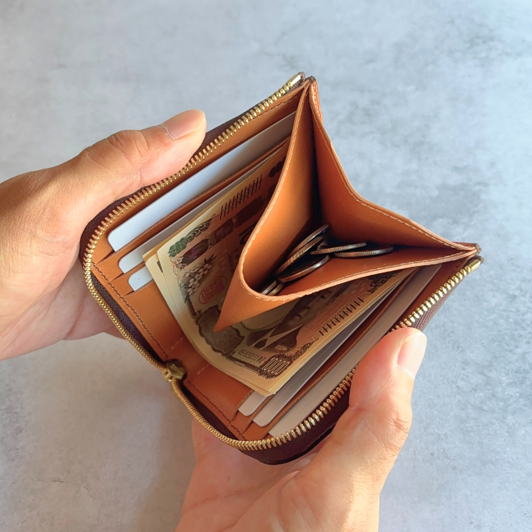 カード、お札、硬貨が全て入って手のひらサイズに収まるシンプルな財布です。