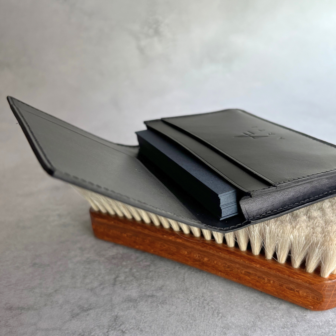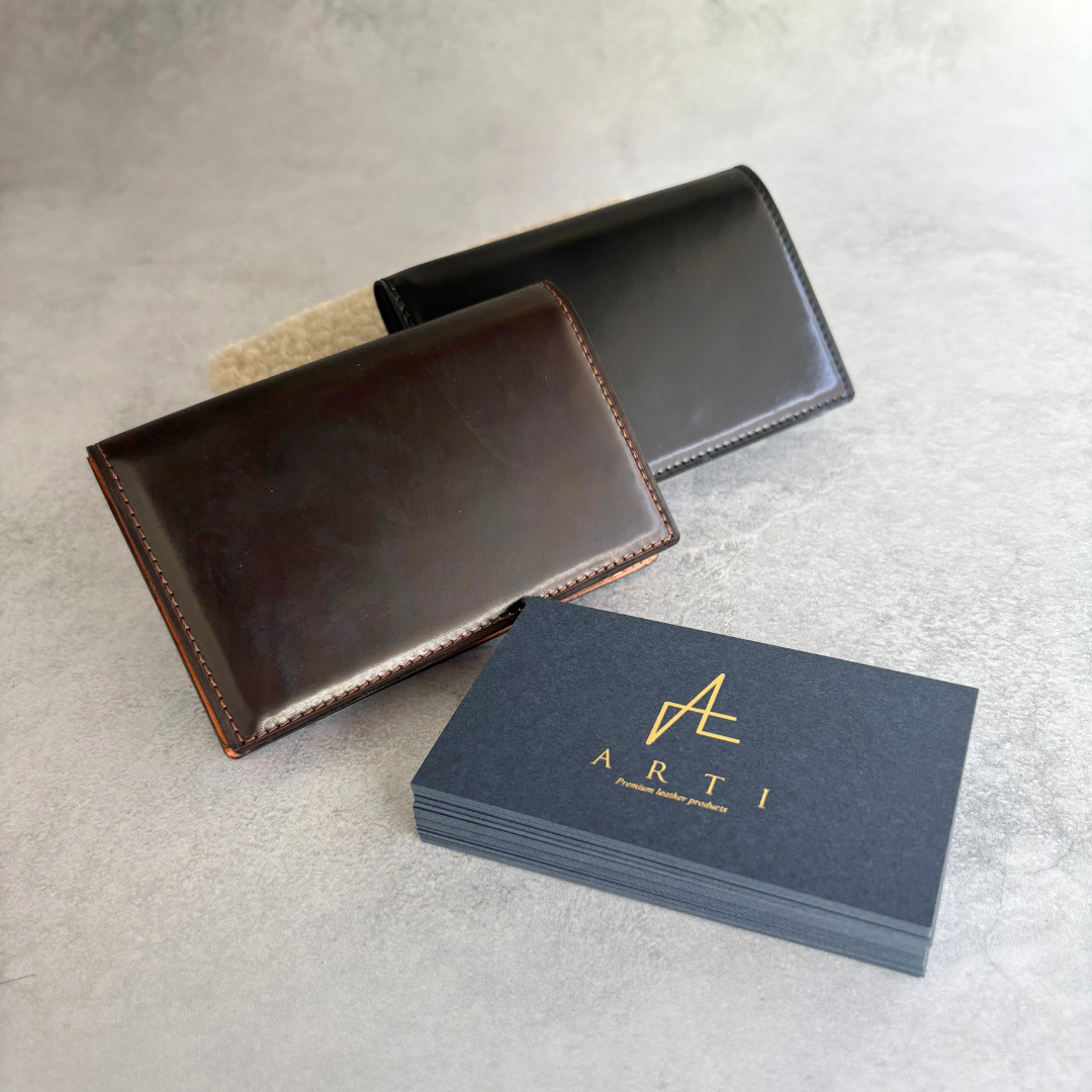 名刺を差し出す、受け取る。その一瞬の所作は、相手の記憶に静かに残ります。ビジネスシーンで自分を印象づける重要なアイテムだからこそ、素材と仕立てを大切にした名刺入れを。外装にはホーウィン社のシェルコードバンを使用し、内装にはブルガロを合わせています。