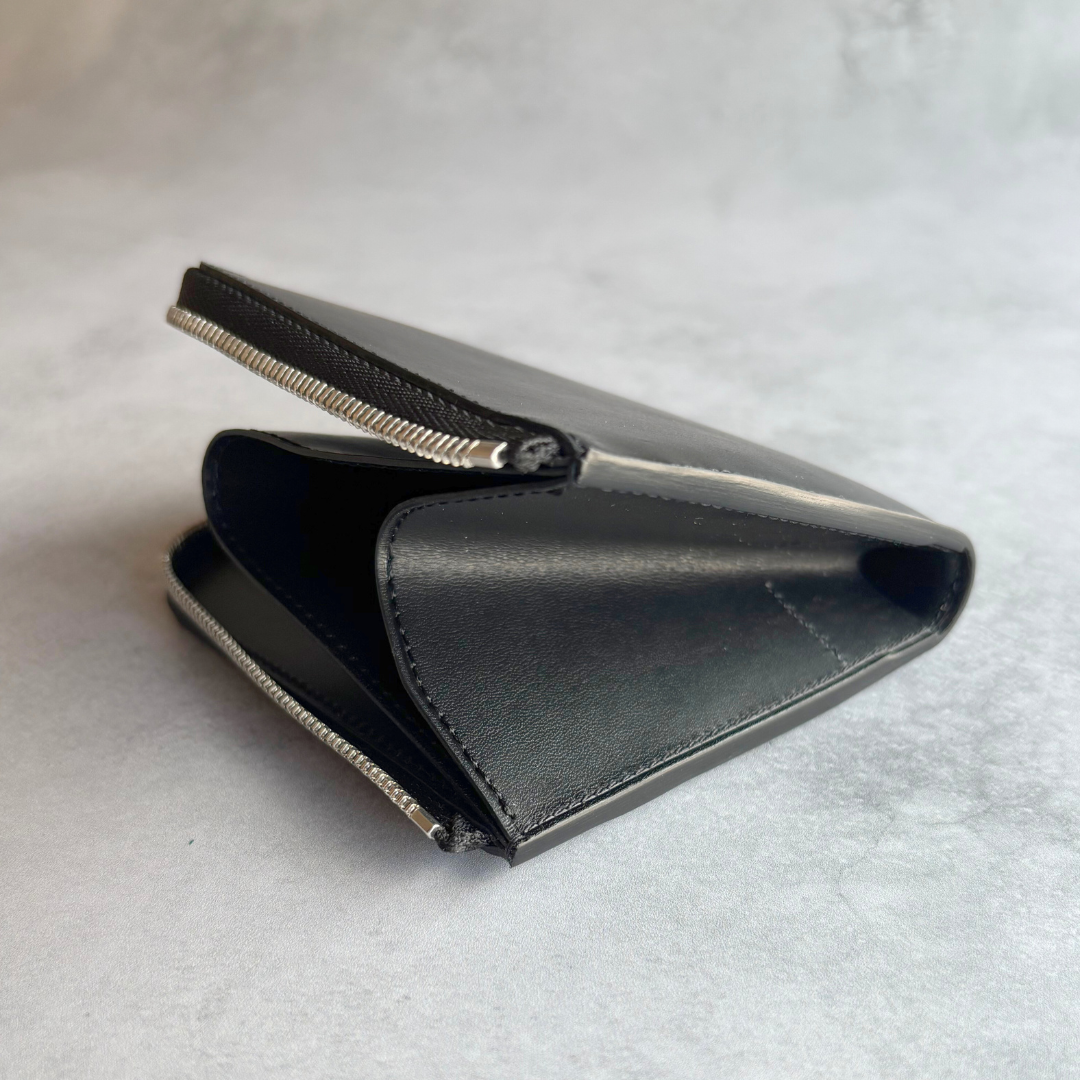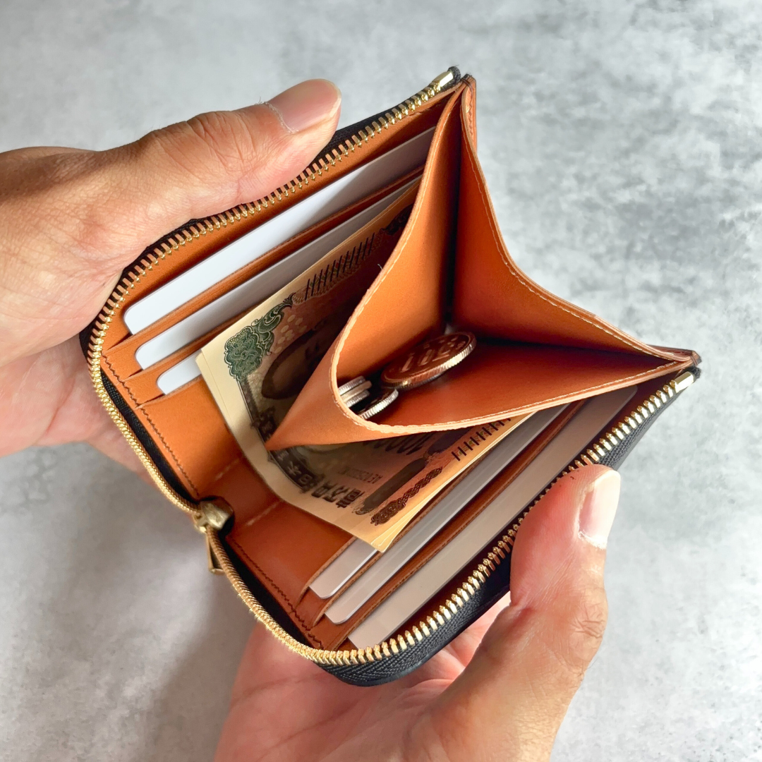 カード、お札、硬貨が全て入って手のひらサイズに収まるシンプルな財布です。